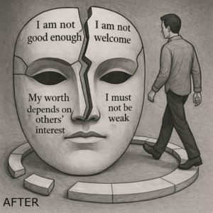 These worries are like puzzle pieces… whenever we think something about ourselves—how we are, are not, should be, or are not allowed to be—a piece of this „mask“ reveals itself.